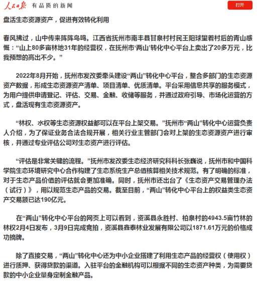 2024年3月21日,《人民日?qǐng)?bào)》以“盤(pán)活生態(tài)資源資產(chǎn),促進(jìn)有效轉(zhuǎn)化利用”為題,向全國(guó)推介“兩山”轉(zhuǎn)化中心平臺(tái)。